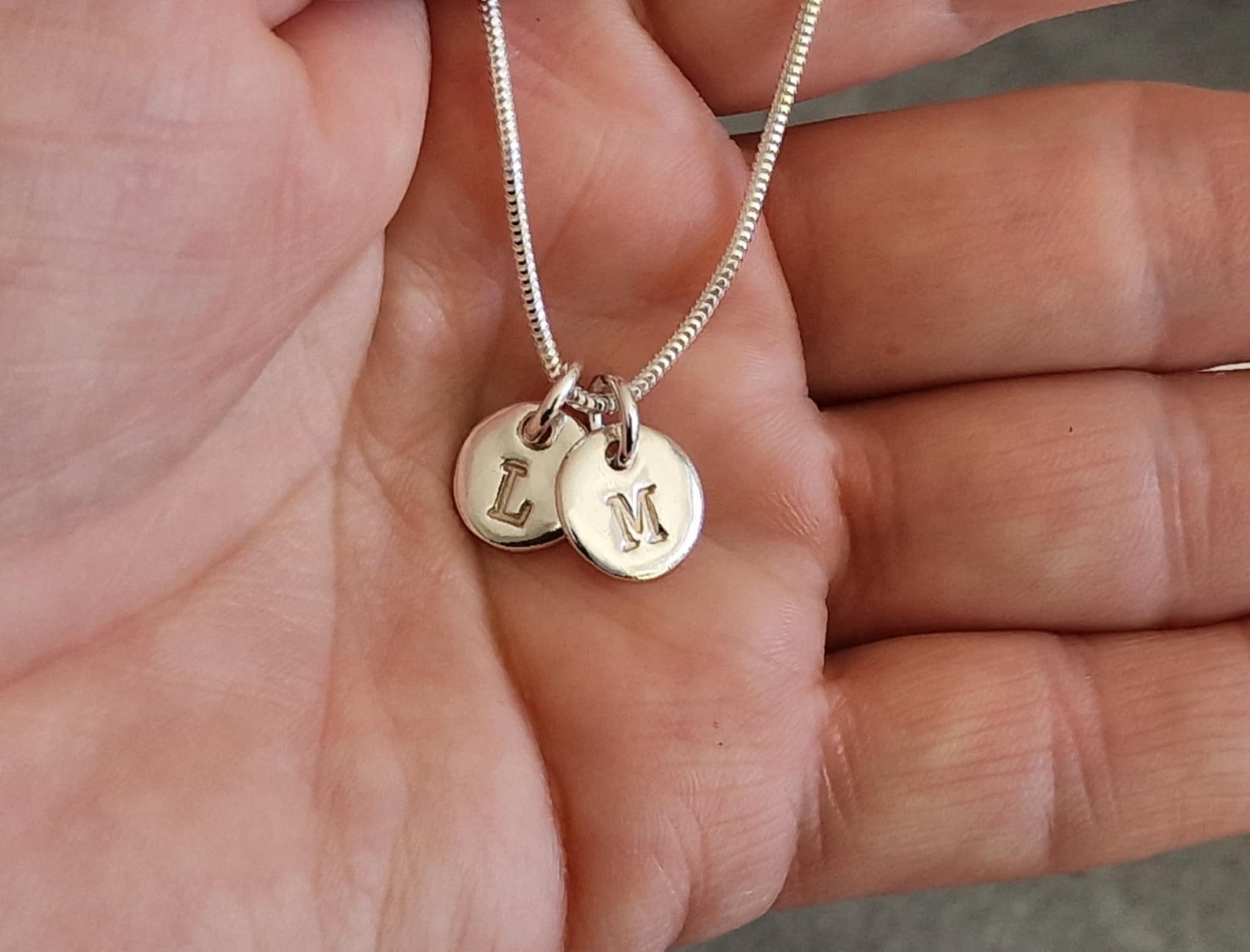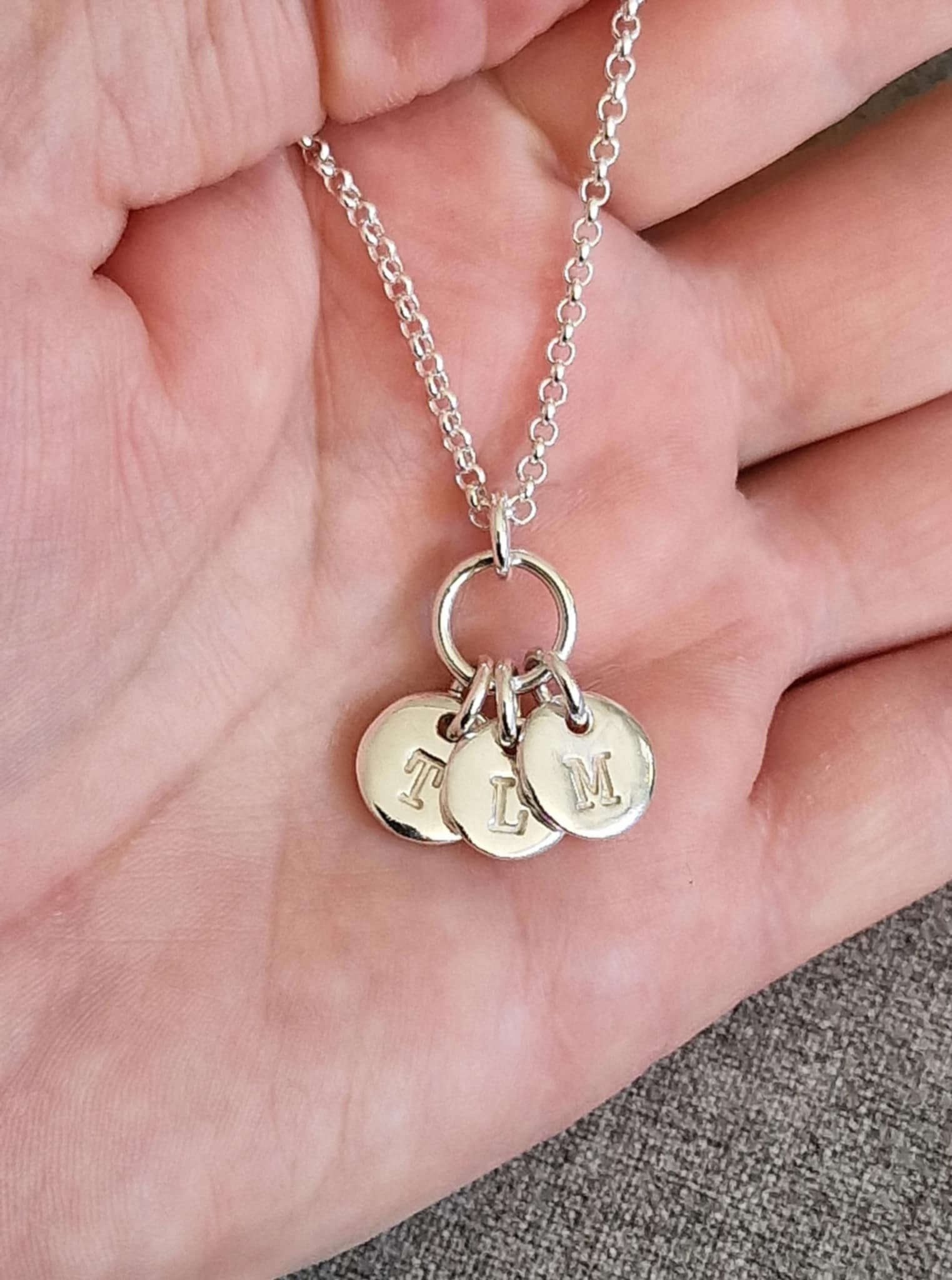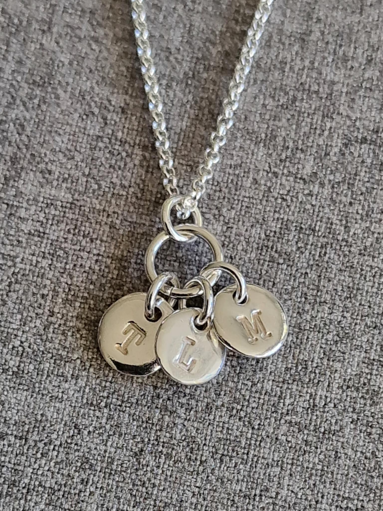 Komponera ditt eget enkla personliga smycke – handgjorda mjukt rundade bokstavsbrickor , högglansigt polerade i äkta silver.